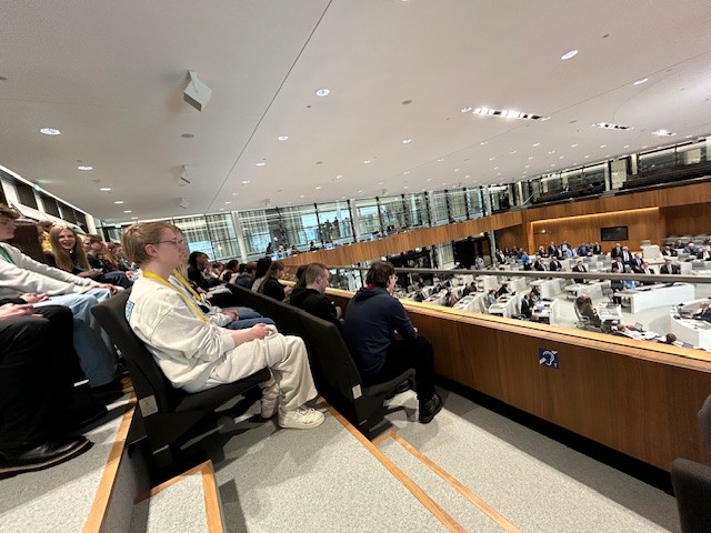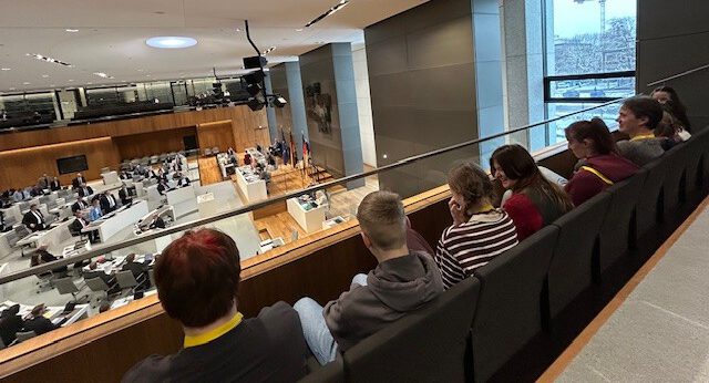 Danach nahmen sie auf der Besuchertribüne des Plenarsaals Platz. Dort konnten sie eine laufende Landtagssitzung verfolgen und beobachten, wie Abgeordnete Redebeiträge hielten, Anträge diskutierten und über politische Themen debattierten.